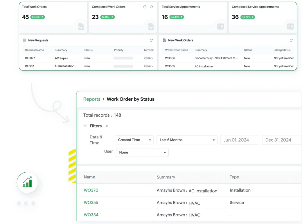 - Deep reporting and analytics for revenue tracking, technician performance, and job profitability.