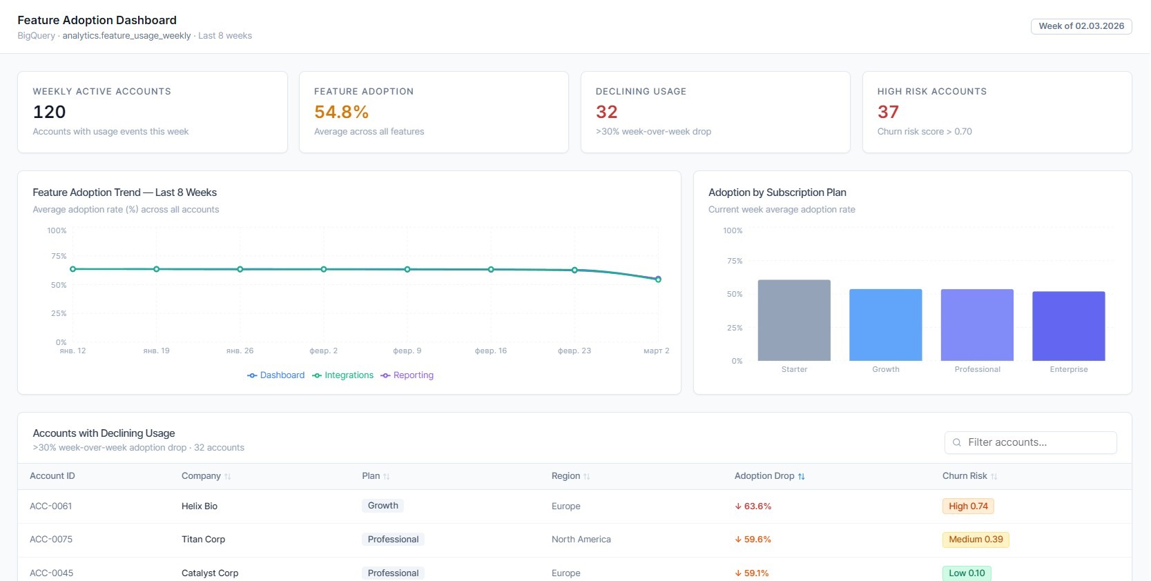 Below the summary metrics, the application highlights accounts experiencing significant week-over-week adoption decline. Interactive filtering allows product managers to isolate segments based on region, subscription tier, or engagement thresholds without writing SQL queries manually.