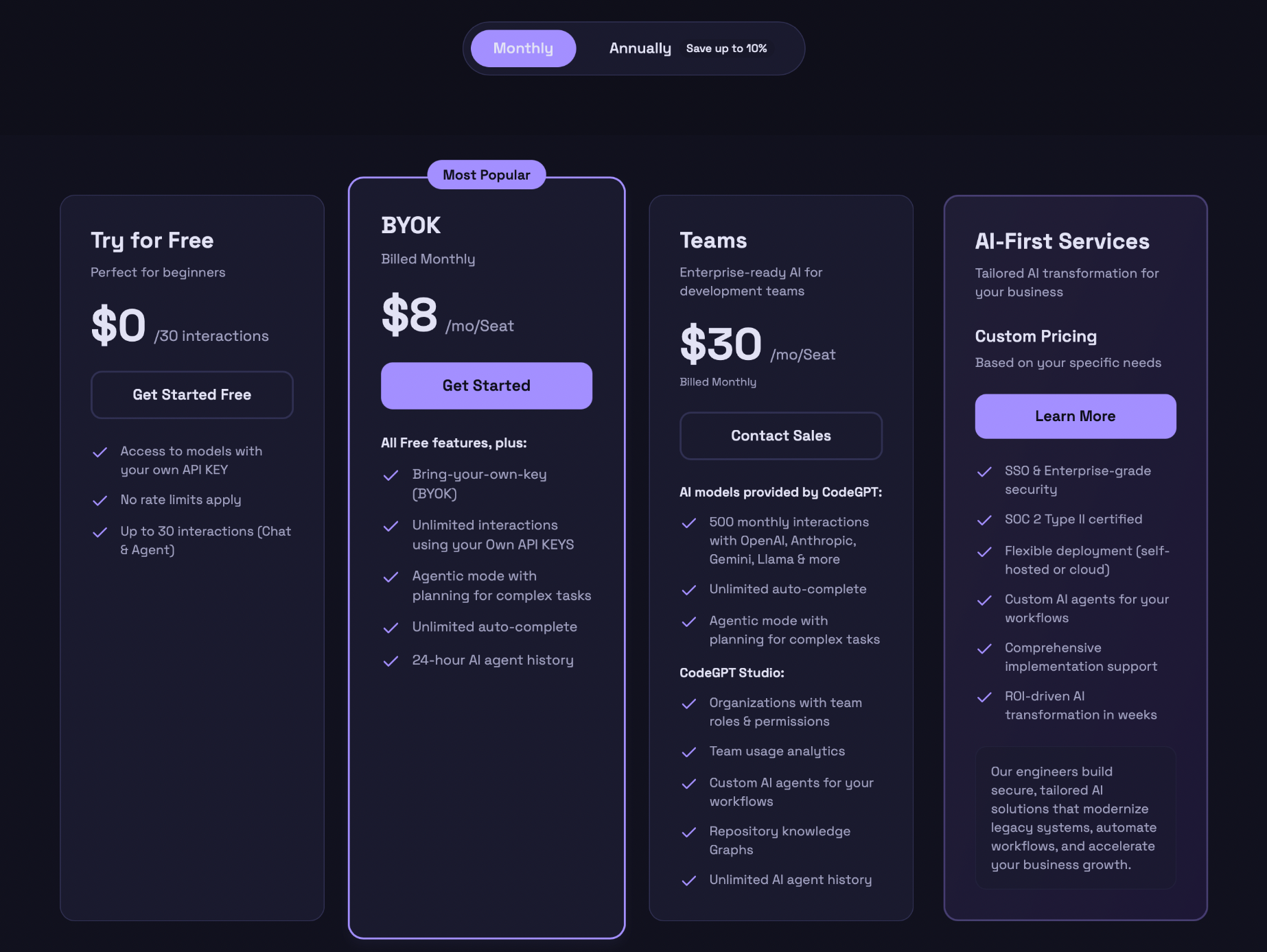 CodeGPT is a model-agnostic AI coding assistant. It lets you pick your AI provider, retain control over data and billing, and still get powerful AI-driven code completion, debugging, and “AI pair-programming.” But as with any tool, the right plan can make all the difference.